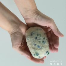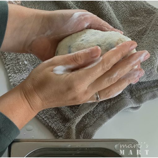 A gyapjúszálak a nedvesség és a szappanhab hatására összeakadnak egymással, minél tovább dolgozol rajta, annál szorosabban feszül majd rá a nemezelt anyag a szappanra.