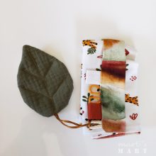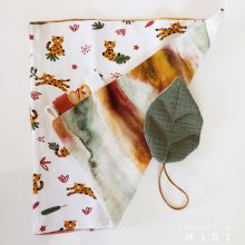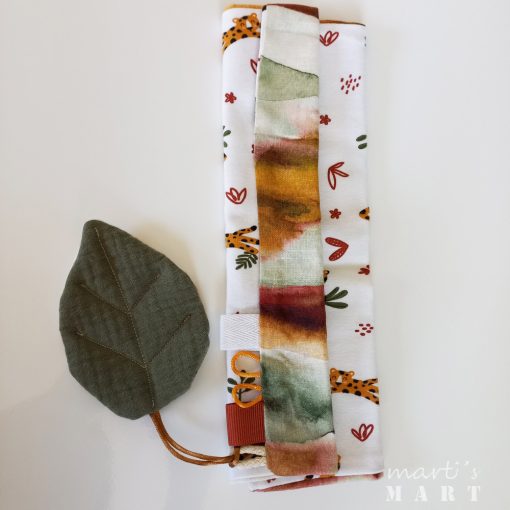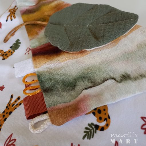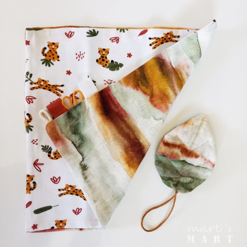 A kedves leopárd minta egy igazi trendi, batikolt hatású - a mohazöld, az okkersárga, és a rozsdavörös árnyalataiból keveredő - színes minőségi pamuttal párosul. A színeivel jól illik bármilyen környezetbe.