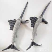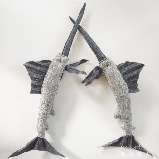 A kard éles pengéjét, itt filccel helyettesítettük, a markolat a hal teste, puha kárpitból készült.