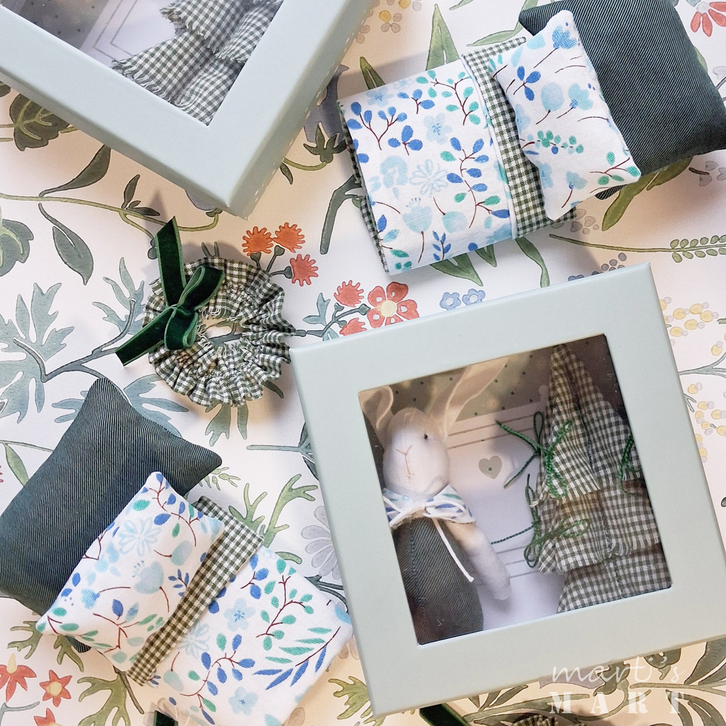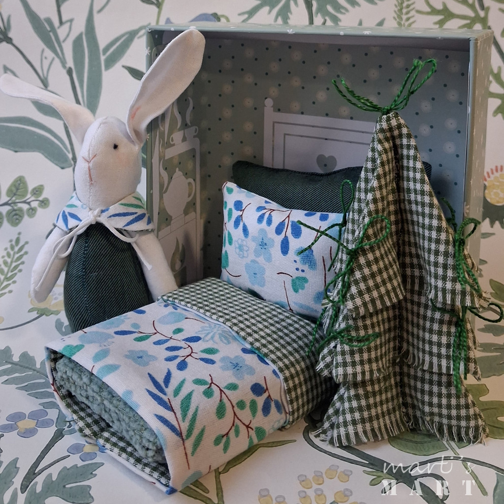 A téli hangulatú doboz szettben találod a maroknyi nyuszit egy csinos ünnepi gallérban. A doboz belsejében egy mini enteriőrt rendeztem be a szetthez tartozó ágy fejvégével.