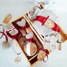 1 db zsanéros fenyőfa doboz fogantyúval, retesszel, 1 db jogar-bábu, 1 db kis bábu, 1 db fagolyó-"alma",