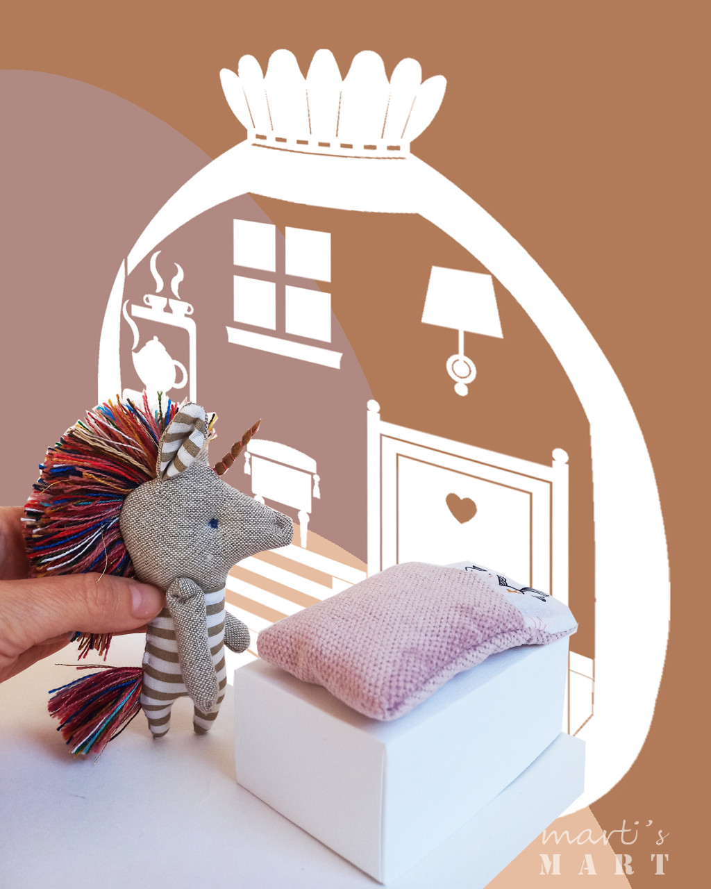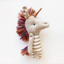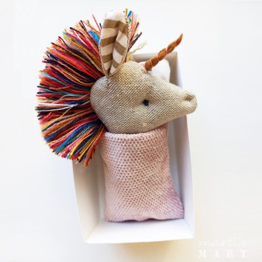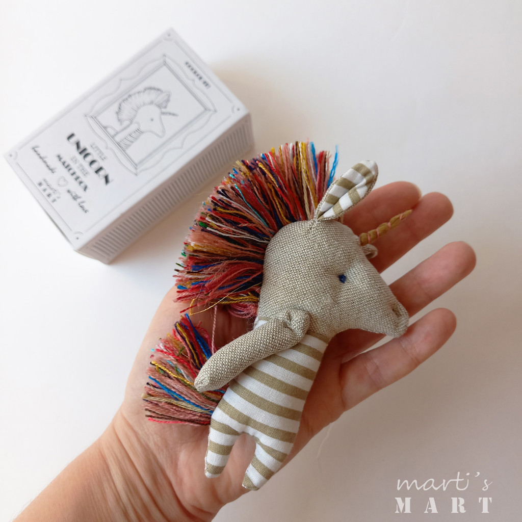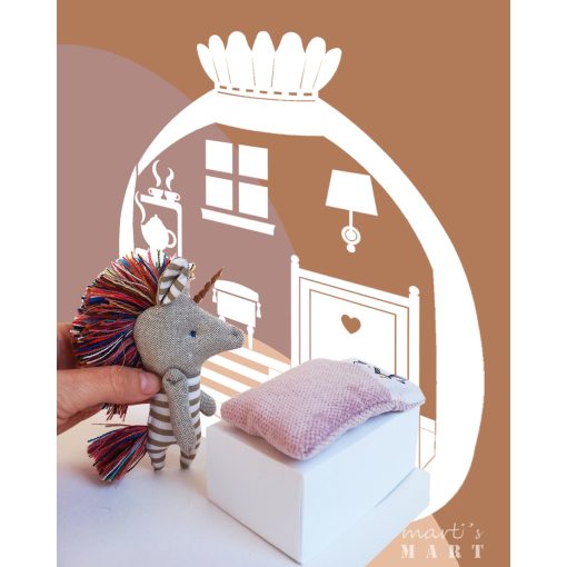 Unikornis - textiljáték gyufásdobozban, marokjáték - bézs csíkos, színes sörénnyel, hálózsákkal