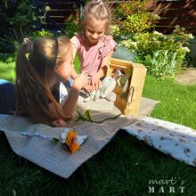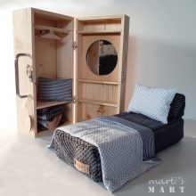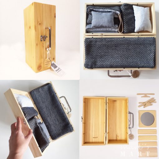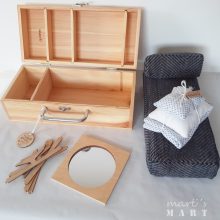 hordozható babaszoba - babaház készlet - szekrény, ruhafogasokkal, tükörrel, ágy ágyneművel, halszálka mintás, sötétkék-fehér csíkos, apró mintás