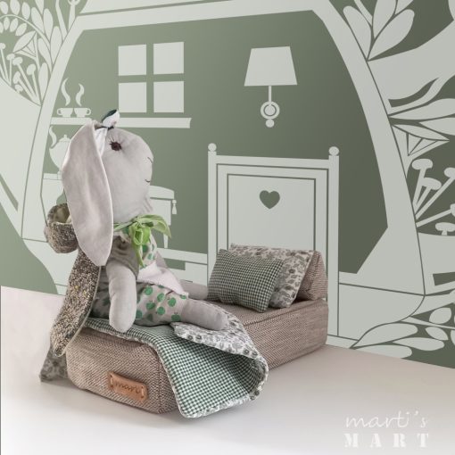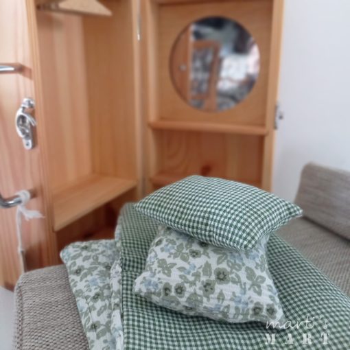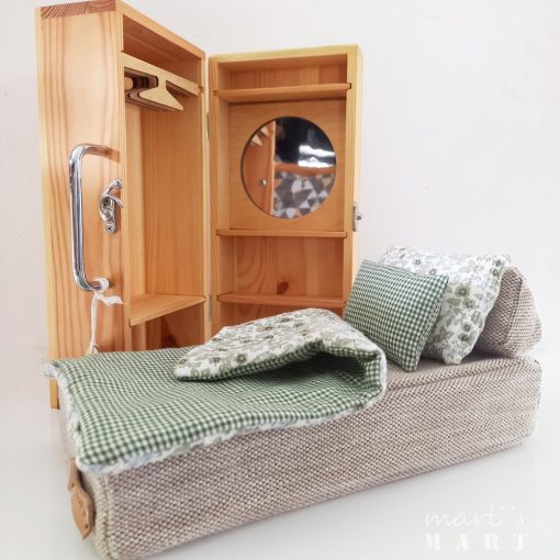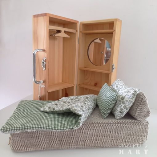 hordozható babaszoba - babaház készlet - szekrény, ruhafogasokkal, tükörrel, ágy ágyneművel, zöld-kockás