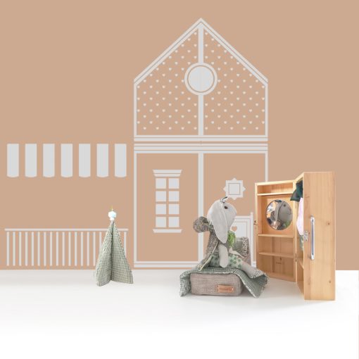 hordozható babaszoba - babaház készlet - szekrény, ruhafogasokkal, tükörrel, ágy ágyneművel, rozsaszín-bézs-barna