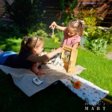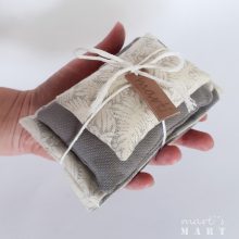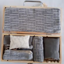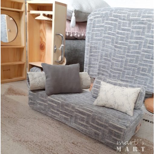 hordozható babaszoba - babaház készlet - szekrény, ruhafogasokkal, tükörrel, ágy ágyneművel, bézs -fehér, tűpöttyös mintás, szürke - bézs - fehér - levél mintás