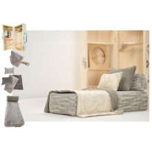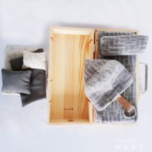 hordozható babaszoba - babaház készlet - szekrény, ruhafogasokkal, tükörrel, ágy ágyneművel, bézs -fehér, tűpöttyös mintás szürke - bézs - fehér - levél mintás