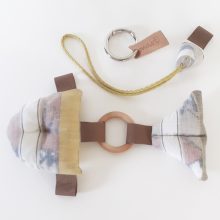 hal - textil rágóka, baba játék, karabinerrel rögzíthető, natúr- bézs-barna-mustár sárga, csíkos-foltos